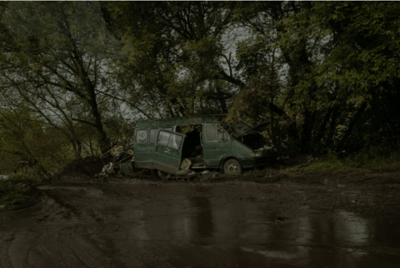 Во время медиа-тура, организованного украинским правительством по недавно отвоеванной территории, автомобиль, используемый российскими войсками, стоял на дороге за пределами Балаклеи. Фото… Николь Тунг для The New York Times