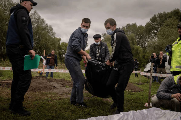 В Балаклее полиция во вторник эксгумировала тела двух мужчин, которые, по их словам, были расстреляны в последние, панические дни перед уходом русских. Работая в густой вони, офицеры застегнули трупы в мешки для трупов и погрузили их в катафалк, везя на вскрытие. По данным украинской прокуратуры, в городе и близлежащих районах на данный момент обнаружено около десятка тел.