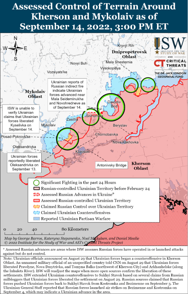 14 сентября украинские военные источники хранили оперативное молчание. Глава Херсонского областного совета Александр Самойленко сообщил, что украинские силы освободили Киселевку, примерно в 23 км к северо-западу от города Херсон, но украинские военные на данный момент не подтвердили факт освобождения населенного пункта. ISW не видела никаких визуальных доказательств, подтверждающих заявление Самойленко, а российские источники опровергли местные украинские сообщения о наступлении в этом районе. Украинское Южное оперативное командование сообщило, что украинские удары постоянно подрывают усилия России по ремонту Каховского моста через реку Днепр и сделали непроходимым понтонный мост в районе Даривка через реку Ингулец. Сообщается, что украинские силы продолжают обстреливать российские переходы в районе Антоновки и ведут огонь по российским колоннам. Украинские силы продолжали свою кампанию перехвата, по сообщениям, нанося удары по пунктам сосредоточения российской живой силы и техники в Голой Пристани (примерно в 12 км к юго-западу от города Херсон), Дудчанах и Мылове (оба на трассе Т0403). Южное оперативное командование также заявило, что украинские силы нанесли ущерб четырем складам боеприпасов в Херсонской области. В Генштабе Украины также отметили, что российские войска продолжали размещать войска в жилых районах, в частности, в Чаплынском районе к северу от границы Херсонской области с Крымом.