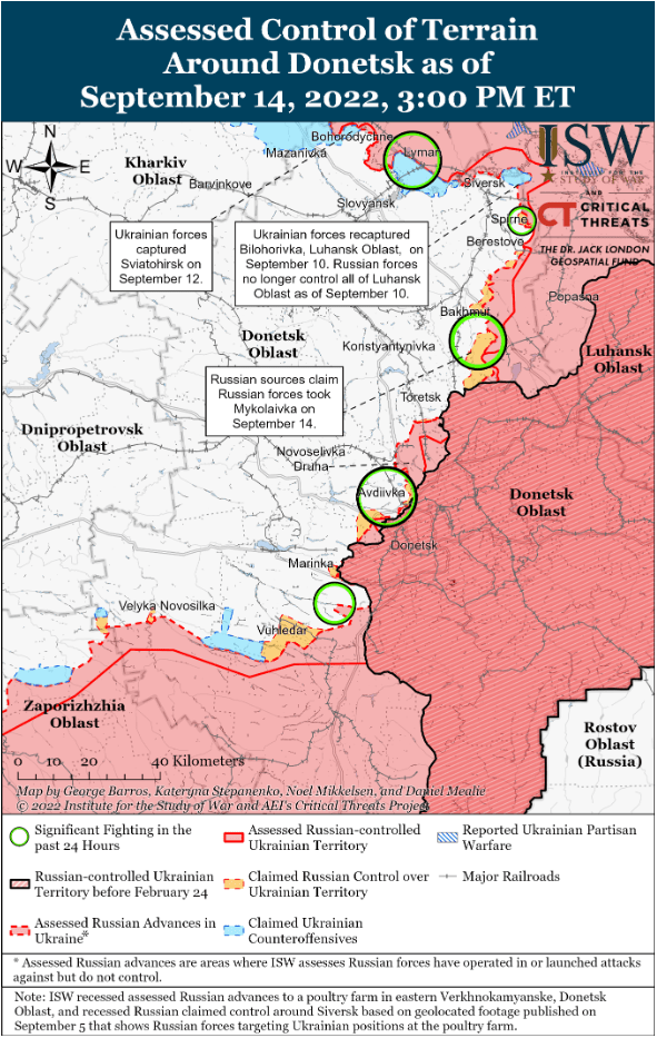 Украинское контрнаступление в восточной части Харьковской области продолжает поражать российские силы и угрожать российской артиллерии и ПВО. 14 сентября Генеральный штаб Украины сообщил, что интенсивность российских артиллерийских обстрелов Харькова значительно снизилась, что свидетельствует о том, что контрнаступление Украины ослабило способность российских войск наносить обычные артиллерийские удары по центру Харькова, поскольку российские войска были оттеснены на восток к реке Оскол и на север обратно в Россию. Украинское наступление на востоке Украины, вероятно, вынудило российские силы отвести средства ПВО подальше от линии фронта, чтобы защитить эти системы от огня украинской артиллерии, что потенциально может подвергнуть передовые российские войска атакам с воздуха. 14 сентября Генштаб Украины сообщил, что 11 и 12 сентября российские колонны с комплексами С-300 и «Бук» двигались через Лутугино Луганской области в направлении российской границы.