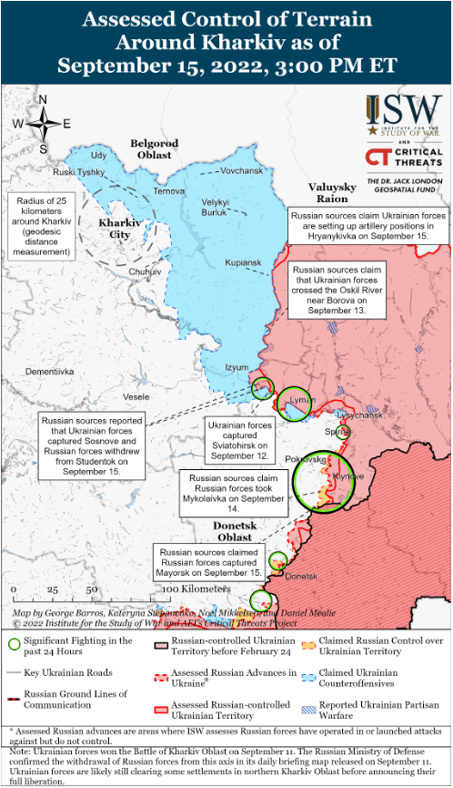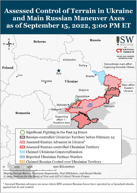 Украинские силы продолжают контрнаступательные операции на востоке Украины, усиливая давление на российские позиции и линии тылового обеспечения в восточной части Харьковской, северной Луганской и восточной Донецкой областях. Российские источники сообщили, что украинские силы продолжают наземные операции к юго-западу от Изюма, возле Лимана и на восточном берегу реки Оскол, что, как сообщается, вынуждает российские силы уйти из некоторых районов на востоке Украины и усилить другие. Российским силам на востоке Украины, скорее всего, будет трудно удерживать свои оборонительные рубежи, если украинские силы продолжат продвигаться дальше на восток.