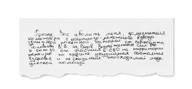 10 рукописных писем, датированных 30 августа, были оставлены в двухэтажном жилом доме, где на корточках сидели русские, и позже были найдены украинскими военными, которые предоставили письма для ознакомления The Washington Post. Они рисуют портрет удрученных солдат, отчаянно нуждающихся в отдыхе и обеспокоенных своим здоровьем и моральным духом после месяцев боев.