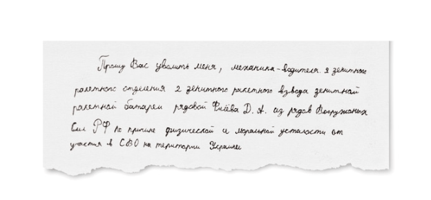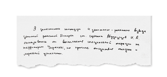 «Я отказываюсь от исполнения своих обязанностей в спецоперации на территории Украины в связи с отсутствием отпускных дней и моральным истощением», — написал мужчина, назвавшийся командиром зенитно-ракетного взвода из Московской области.