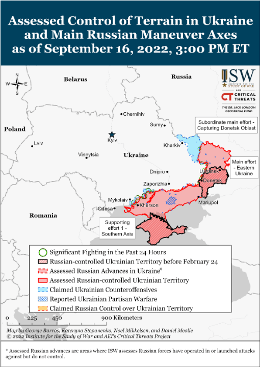 Исправление: обновление ISW от 15 сентября 2022 г. содержало несколько ошибок. Мы ошибочно отнесли Кинбурнскую косу к Крыму, а не к Херсонской области. Мы сообщали об атаках украинских войск к северо-западу от Харькова, а не от Херсона. И мы сообщили, что украинские операции продолжаются к юго-западу от Изюма, возле Лимана, а не к юго-востоку от Изюма. Мы приносим свои извинения за эти опечатки, которые были исправлены в тексте обновления от 15 сентября.