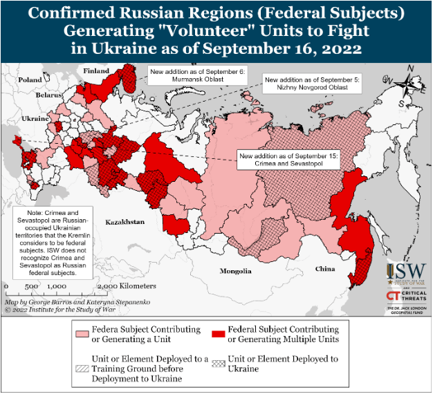 Другие местные лидеры объявили о создании новых батальонов в поддержку призыва Кадырова 16 сентября. Губернатор Кировской области Александр Соколов объявил, что в Кирове сформирован второй добровольческий батальон под названием «Широнин», и заявил, что областной Вятский добровольческий батальон уже воюет в Украине. Назначенный Россией глава оккупированного Крыма Сергей Аксенов сообщил 16 сентября, что Крым наращивает усилия по набору добровольцев. Аксенов сообщил, что неназванные крупные банковские учреждения присоединились к усилиям по финансированию обеспечения необходимой современной техникой добровольческих батальонов. Губернатор Магаданской области Сергей Носов заявил о финансовой поддержке призыва Кадырова и призвал все регионы к самомобилизации, даже такие небольшие регионы, как его собственный Магадан, где есть только один военкомат. Главы Воронежской, Чувашской и Башкирской областей также заявили о своей поддержке самомобилизации и заявили, что около 1000 добровольцев от каждой из их областей уже развернуты. Губернатор Кемерово Сергей Цивилев пообещал финансовую поддержку добровольческим батальонам и заявил, что многие кемеровчане уже воюют в российской армии. Сам Кадыров объявил 16 сентября, что два его чеченских батальона «Ахмат» — «Восток» и «Запад» — переброшены в неустановленные районы Донбасса. Кадыров также сообщил, что создал еще одно подразделение ОМОН «Ахмат-1» численностью 2000 человек с тяжелым вооружением, и заявил, что это не последнее подразделение, которое он и Чеченская Республика выставит. Он заявил, что его новое подразделение будет вести огонь по украинскому и западному персоналу (который, как обычно и безосновательно утверждает Кадыров, напрямую воюет с украинскими военными) в Украине, но не уточнил, развернуто ли уже это подразделение.