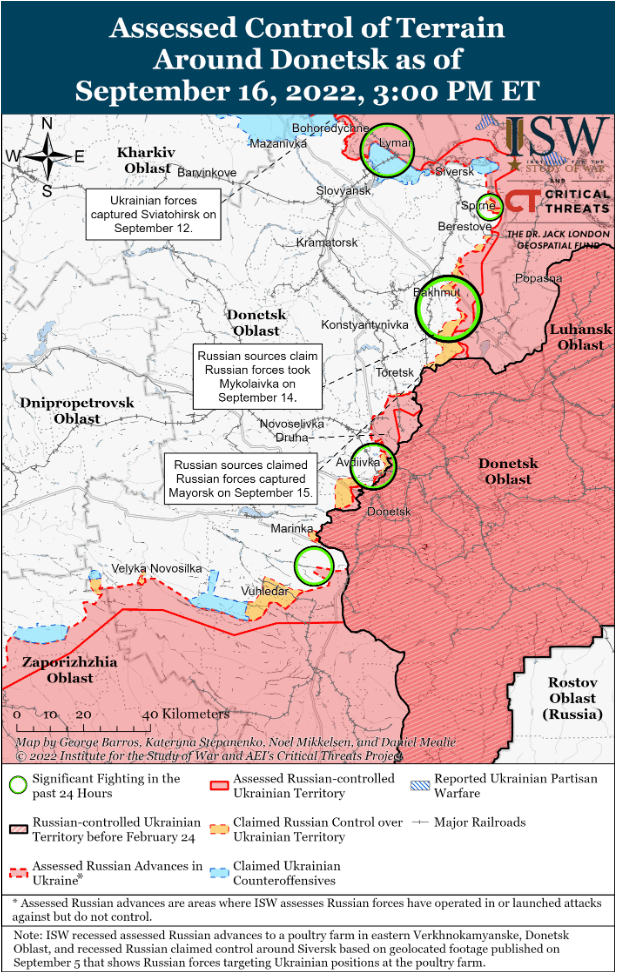 Российские силы продолжали обороняться от украинских контрнаступательных операций на северо-востоке Украины. Украинский Генштаб сообщил, что российские войска обстреляли Приштынь к северо-востоку от Изюма на западном берегу реки Оскол, вероятно, чтобы помешать украинским войскам установить еще один плацдарм через реку. Народное ополчение Донецкой Народной Республики (ДНР) заявило, что российские силы продолжают оборонять Лиман от украинских наземных атак и обстрелов. Геолокационные снимки от 15 сентября подтверждают, что российские силы удерживают позиции в Лимане. Однако Генштаб Украины сообщил, что российские войска обстреляли Лиман, что указывает на то, что украинские силы, возможно, добились определенных успехов вокруг населенного пункта.