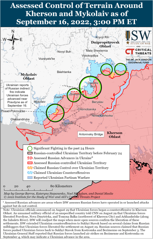 Украинские и российские источники указали на три направления кинетической активности 16 сентября: к северо-западу от города Херсон, вблизи украинского плацдарма на реке Ингулец и к югу от границы Херсонско-Днепропетровской области к западу от Высокополья. Милблогеры и представители ДНР утверждали, что 16 сентября российские силы ВДВ отразили украинскую атаку в районе Правдино (к северо-западу от города Херсон). Однако Генштаб Украины сообщил, что российские войска обстреляли украинские позиции в Правдино, что указывает на то, что украинские силы, вероятно, как минимум вошли в город. Кадры с геолокацией запечатлели военного корреспондента ДНР в Александровке (непосредственно к западу от Херсона) 16 сентября, что подтверждает, что российские силы сохраняют контроль над городом, несмотря на недавние украинские атаки. Снимки, опубликованные пророссийскими телеграм-каналами, подтвердили, что 16 сентября российские силы отразили атаку украинской морской пехоты в районе Андреевки (у украинского плацдарма на реке Ингулец). Российские милблогеры сообщали, что украинские силы продолжают перебрасывать войска и технику в районы Андреевки и Белогорки, но повышение уровня воды в реке Ингулец из-за ударов России по плотинам в Кривом Роге заблокировало половину украинских пропускных пунктов. Генеральный штаб Украины сообщил, что российские войска обстреляли Новопетровку (к югу от Кривого Рога) 16 сентября, предполагая, что украинские войска оккупировали город, несмотря на предыдущие заявления России об отражении украинских атак на город.