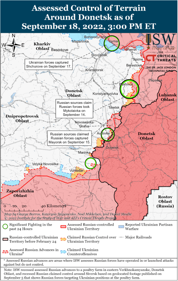 Украинские официальные лица заявили, что украинские силы ждут падения Лимана, прежде чем начать наземные операции по возвращению Луганской области. Сообщается, что 18 сентября украинские силы нанесли удар по российскому логистическому узлу в Сватово Луганской области. Сватово служило узловым пунктом на российских наземных коммуникациях (ГЛОК) с Северодонецком. Гайдай отметил, что российские войска строят укрепления в районах, близких к линии фронта, включая Сватово, Троицкое, Рубежное и Попасную. Украинские удары по российским тылам подрывают эти усилия и снизят способность российских войск защищать эти районы в случае наступления Украины. Более того, эти позиции расположены недалеко друг от друга, и российским силам в этом районе может быть сложно сформировать четкие линии обороны на такой широкой территории.