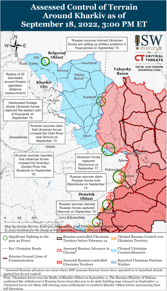 - Российские войска понесли огромные потери в живой силе и технике в боях за восток Украины и особенно во время украинского контрнаступления в Харьковской области. Согласно оценкам, опубликованным 18 сентября, многочисленные российские бронетанковые и механизированные подразделения, вероятно, были фактически уничтожены.