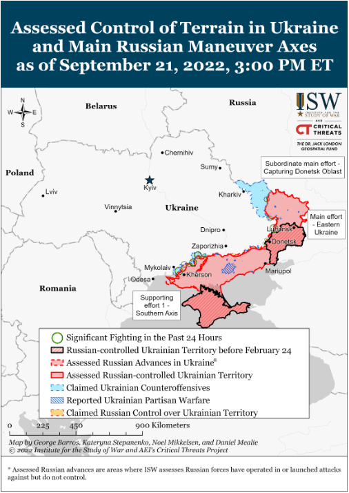 Назначенные Россией оккупационные власти, вероятно, усиливают правоохранительные и фильтрационные меры на оккупированных территориях Украины, чтобы сохранить контроль над украинским населением и упредить партизанские атаки в преддверии фиктивных референдумов об аннексии, которые в настоящее время запланированы на 23–27 сентября. Украинский глава Херсонской области Ярослав Янушевич заявил 21 сентября, что российские силы усиливают фильтрационные мероприятия и проверки частной собственности на всей оккупированной Херсонщине. Поддерживаемые Россией власти также ужесточили ограничения на передвижение с оккупированных территорий, что, вероятно, предотвратит бегство значительной части населения с оккупированных территорий на территорию, удерживаемую Украиной, в преддверии незаконной аннексии Россией оккупированной украинской территории и российской «частичной мобилизации». Советник мэра Мариуполя Петр Андрющенко заявил, что пророссийская комендатура в Мариуполе с 1 октября прекратит выдачу пропусков гражданам, желающим покинуть оккупированные части Донецкой области. Андрющенко также отметил, что российские силы на блокпосту в Васильевке Запорожской области вводят спецпропуска и усиливают ограничения для желающих покинуть оккупированную Запорожскую область.