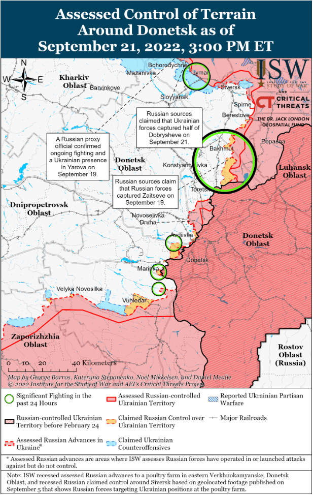 21 сентября российские войска продолжали наземные атаки на восточную окраину Бахмута и Авдеевку, а также продолжали обычный огонь вдоль линии фронта в Донецкой области. Украинский генеральный штаб сообщил, что украинские войска отразили атаки русских на Веселое к северо-востоку от Соледара; Зайцево и Курдюмовка, южнее Бахмута; и Бахмутское, к северо-востоку от Бахмута. Кадры с геолокацией подтвердили, что украинские силы удерживают позиции на восточной окраине Бахмута, по сообщениям, на территории завода шампанских вин. Украинский генеральный штаб сообщил, что российские войска обстреляли Славянскую ТЭЦ, но не причинили никакого ущерба, вероятно, в рамках продолжающейся кампании России по деградации критически важной инфраструктуры Украины. Российские силы нанесли авиаудары по объектам инфраструктуры в Бахмуте, что свидетельствует о том, что украинские силы все еще удерживают укрепленные позиции в городе.