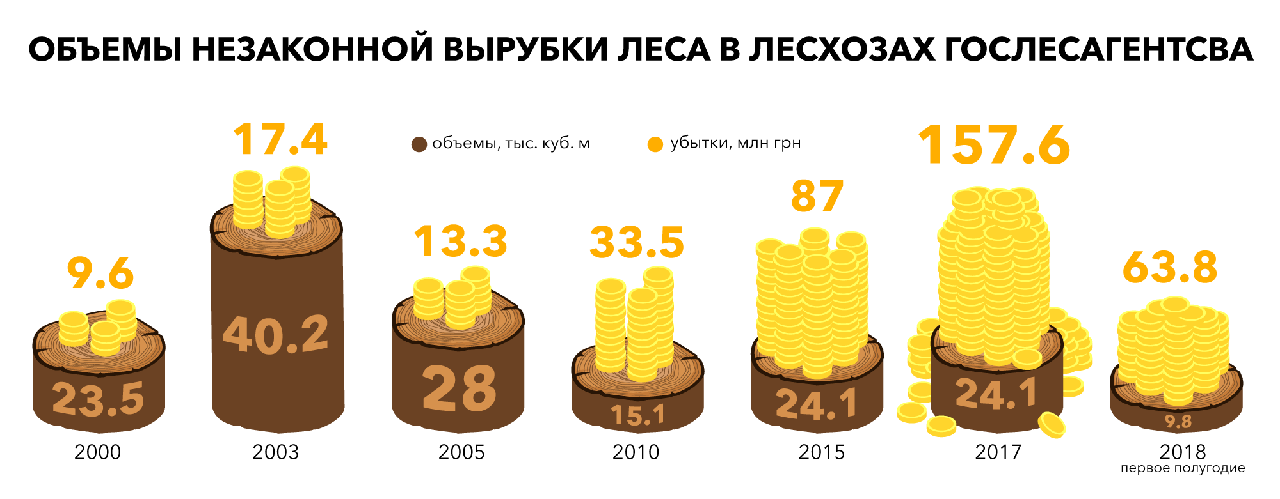 “По итогам прошлого года объем нелегальных вырубок составил около 26 000 куб. м, за первое полугодие 2018 года имеем показатель в 9 000 куб. м. Это при том, что мы заготавливаем около 16 млн куб. м древесины в год. Разве это критичная величина?”, – удивляется Бондарь. При этом убытки исчисляются миллионами, а возместить удается не более 5% всех потерь.