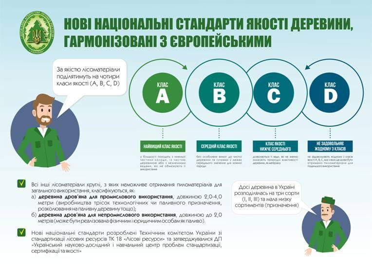 З 01.01.2019 р. державні лісогосподарські підприємства повинні перейти на національні стандарти лісоматеріалів, гармонізовані з європейськими та міжнародними стандартами. Для практичного застосування в перехідний період Держлісагентством України в 2018 р. була прийнята тимчасова коригуюча форма між різними системами класифікації лісоматеріалів (ГОСТ та ДСТУ EN) згідно з якою: