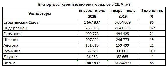 В январе-июле 2019 года основным источником США для европейской хвойной древесины были Нидерланды с объемом 2,04 млн. м3 и долей в 66 процентов от общего американского импорта из Европы. Германия заняла второе место с 494 тыс. м3 и ростом на 21% год к году. Значительные темпы роста были зафиксированы в импорте США из Австрии (+ 21%) и Чехии (+104).