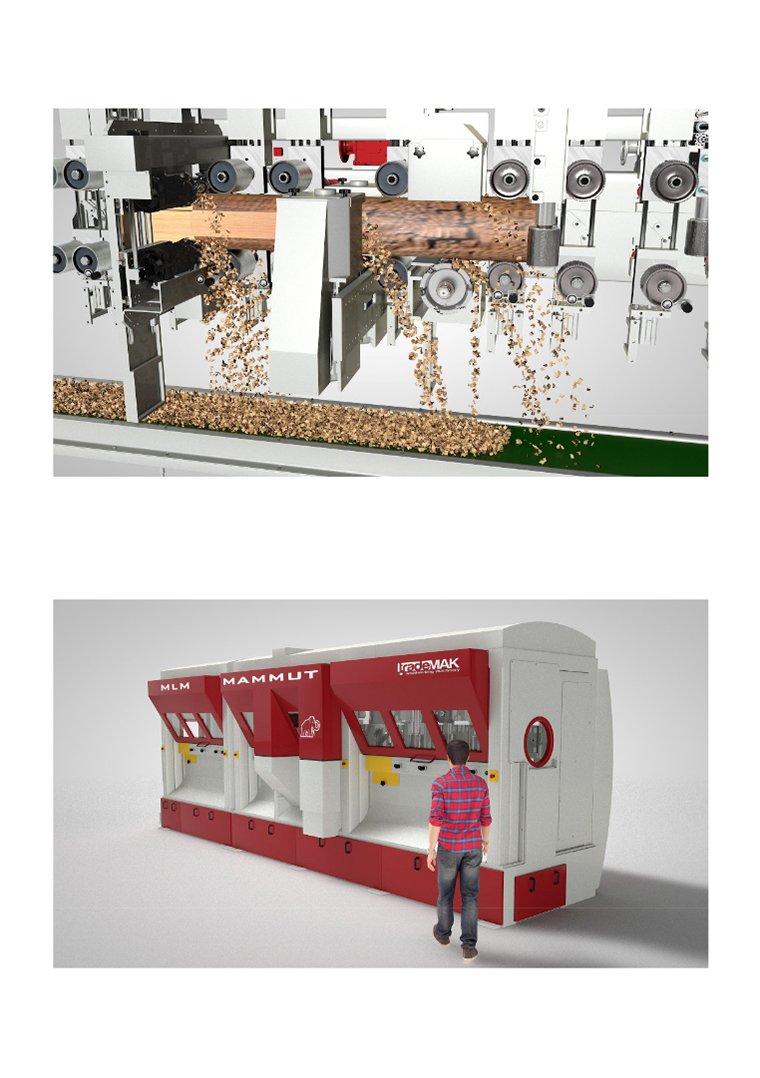 Линия работает без отходов, все отходы сразу же перерабатываются в щепу, которая собирается внутри станка и транспортируется по особой линии в место, запрограммированное оператором. Используется только натуральная транспортировка и никаких пылесосов.