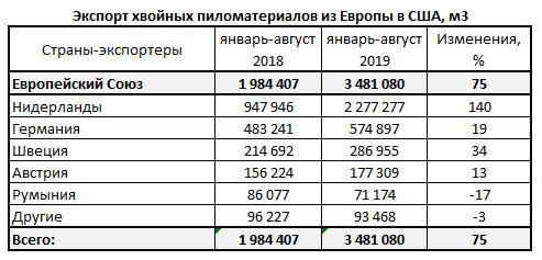 За указанный период объем экспорта составил 3 481 080 м3, причем основным экспортером являются Нидерланды (2 277 272 м3, что на 140% больше, чем в предыдущем году). Германия экспортировала на 19% больше пиломатериалов хвойных пород в США, достигнув объема 574 897 м3, в то время как Швеция отправила на 34% больше поставок, до 286 955 м3.