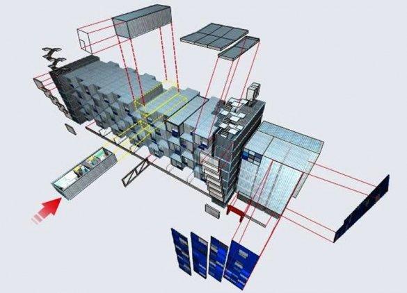 Модули напоминают морские контейнеры, но общего между ними только размеры, т.к. габариты блока ограничены допусками к грузам, которые можно перевозить по железной дороге, или грузовыми автомобилями по дорогам общего пользования.