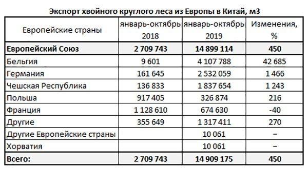 - 15 миллионов м3 круглого леса хвойных пород было экспортировано из Европы в Китай с января по октябрь 2019 года, что на 450% больше, чем в предыдущем году;