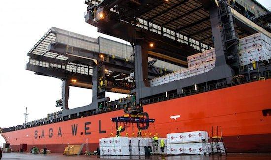 По сравнению с более стандартными 40 – 50 000 м3, Saga Faith – более 65 000 м3. Погрузка заняла больше недели, 22 человека разделились на две смены, загружая от 1600 до 2800 деревянных упаковок в день.