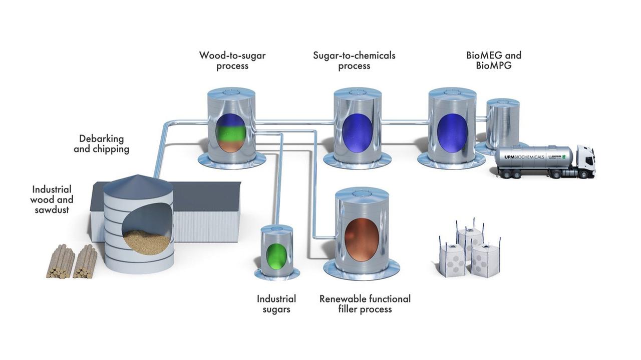 В UPM сообщают, что объем инвестиций в новое производство составит 550 миллионов евро. Биоперерабатывающий завод промышленного масштаба будет превращать твердую древесину в биохимическое сырье следующего поколения: биомоноэтиленгликоль (BioMEG) и возобновляемые материалы на основе лигнина. Кроме того, на производстве будет выпускаться биомонопропиленгликоль (BioMPG) и промышленные сахара.
