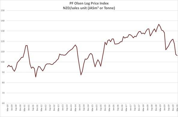 Из-за некоторого снижения внутренних цен на бревно Индекс цен на бревно в PF Olsen Log Price в марте снизился на 1 доллар США до 106 долларов, в настоящее время этот индекс на 18 долларов ниже среднего за два года, на 19 долларов ниже среднего за три года и на 14 долларов ниже среднего за пять лет.