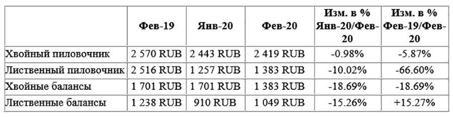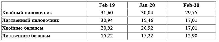 Что касается балансовой древесины, цены демонстрируют смешанную динамику: цены на балансовую древесину хвойных пород в феврале 2020 г. ниже примерно на -18,69% по сравнению с январем 2020 г. и февралем 2019 г. Однако цены на балансовую древесину лиственных пород в феврале 2020 г. выросли на + 15,27% по сравнению с январем,