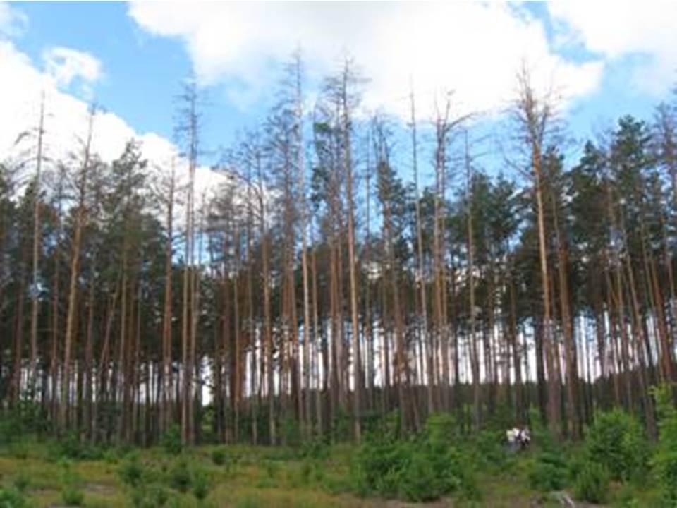 Подібні процеси всихання соснових деревостанів нами відмічені практично на всій території Житомирської області. Протягом останніх 2-х років Поліським філіалом УкрНДІЛГА було проведено дослідження цієї проблеми у лісових насадженнях державних лісогосподарських підприємств: Малинського, Городницького, Новоград-Волинського, Радомишльського, Овруцького, Коростишівського, Попільнянського та Малинського і Коростишівського лісгоспів АПК.