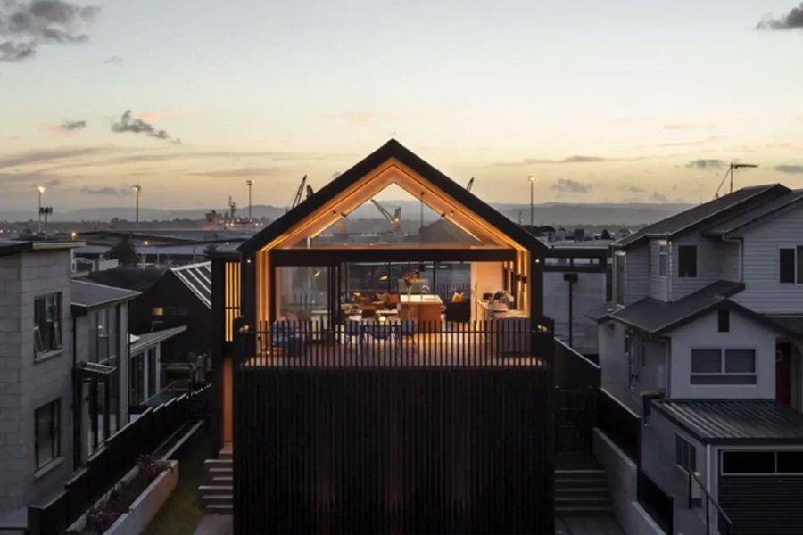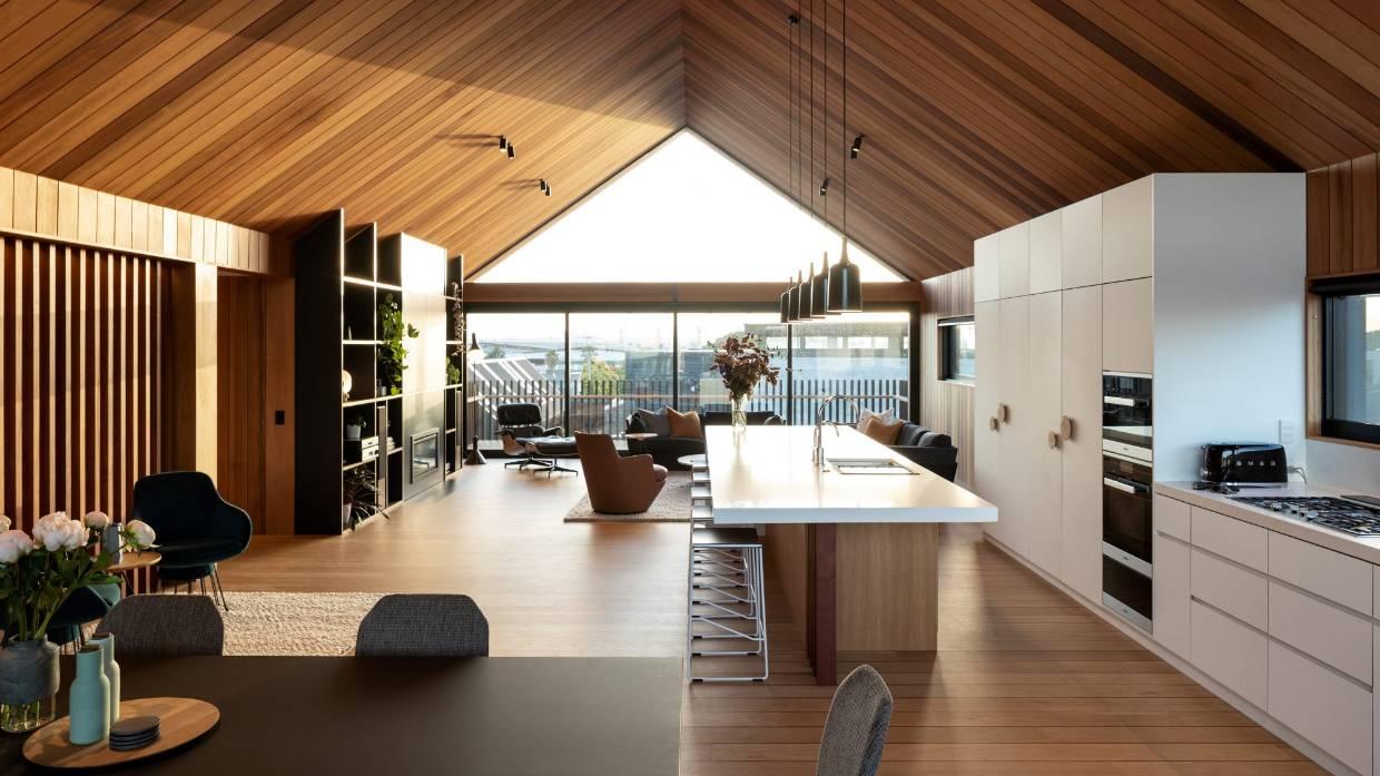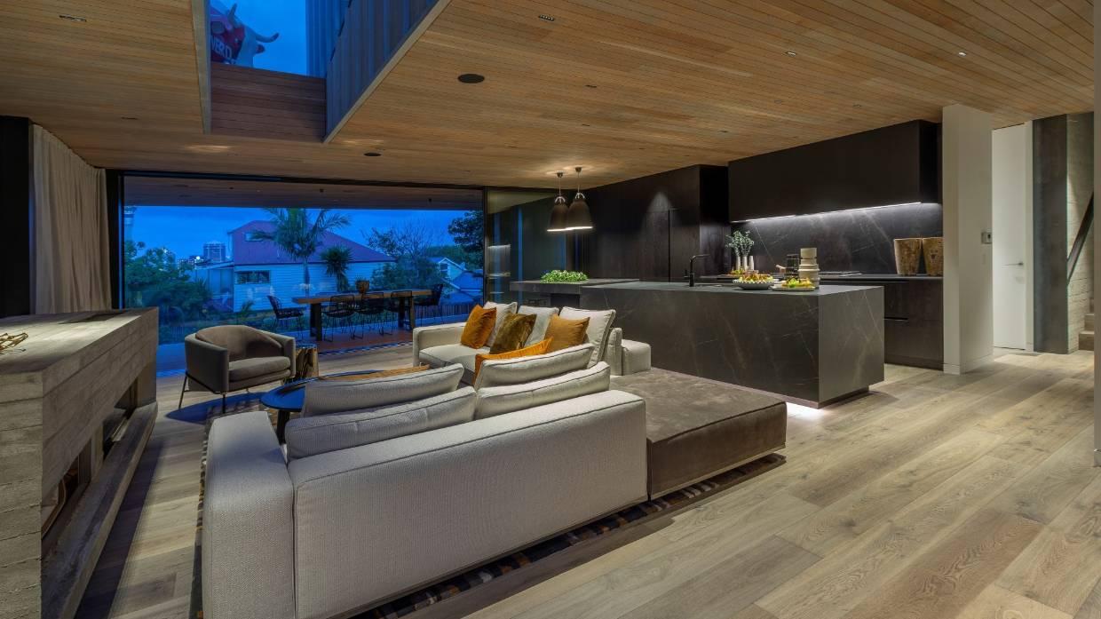 Кухня Cronin, расположенная в новом доме в бухте Фриманс, Окленд, берет свое начало с деревянного потолка и полов, а также из литого бетонного камина. Фото TIDA