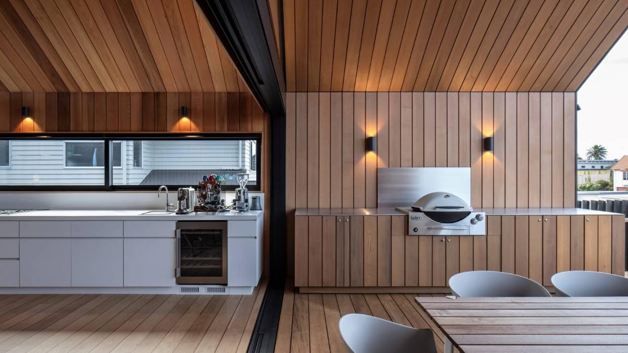 Кухонное оборудование простирается за раздвижными стеклянными стенами на кухню на открытом воздухе со встроенным барбекю и деревянными шкафами, которые продолжают линию древесины на внутренних стенах.