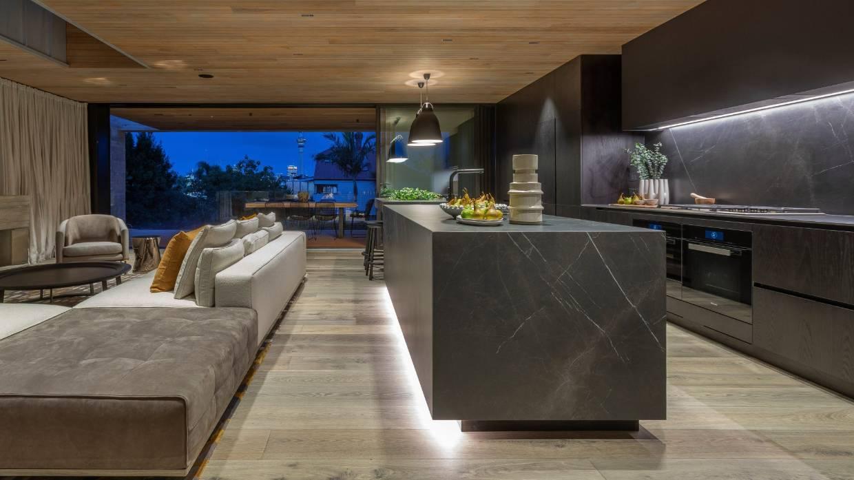 Столешницы и сплитбэк Dekton Opera были согласованы по структуре, а контрастные двери из деревянного шпона помогают гарантировать, что кухня находится в центре жилого пространства.