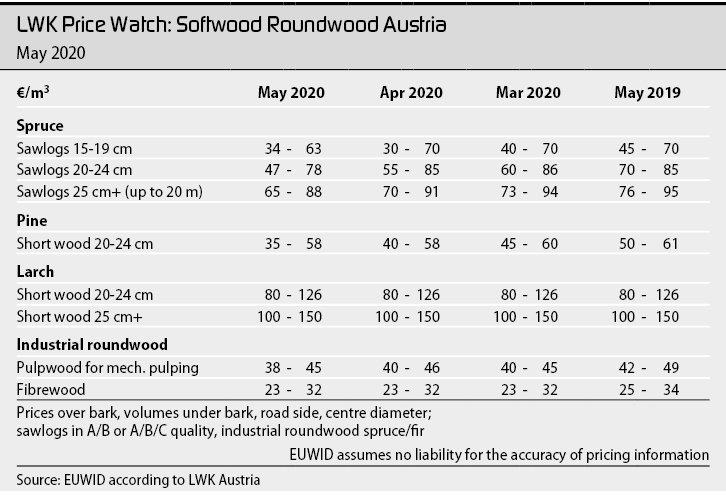 требованием от лесопильной промышленности о снижении цен на пиловочник свежеспиленной ели. Как и в южной Германии, некоторые лесопильные заводы в Австрии снизили свои закупочные цены на здоровые свежеспиленные бревна L 2a ели до всего лишь 55 €/м³ у лесной дороги. Однако основная часть предварительных контрактов, действующих в Верхней и Нижней Австрии во втором квартале, по-прежнему составляет 64–68 евро/м³ у лесной дороги. На западе Австрии этот показатель составляет 70-75 €/м³. На юге Австрии он по-прежнему превышает 70 евро/м³ за пределами районов, где причинен ущерб. Помимо лесозаготовительных работ в районах повреждения, большинство лесовладельцев воздерживаются от вырубки здоровой древесины.