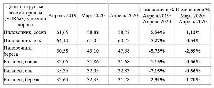 Так, цена на балансовую древесину сосны снизилась по сравнению с аналогичным периодом прошлого года на -1,15%, до 31,68 евро / м3, и снизилась на 0,56% по сравнению с мартом 2020 года. Ель и береза можно было купить за 32,83 евро / м3 и 31,78 евро / м3, что составляет -7,15. % и -2,94% меньше, чем в апреле 2019 года.