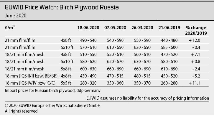 В начале июня несколько крупных российских компаний разослали новый прайс-лист, в котором цены снизились примерно на 5%. Дополнительные скидки, очевидно, также предоставляются для создания новых заказов. Другие производители вообще отказываются от прайс-листов и вместо этого ведут переговоры на индивидуальной основе. По данным разных немецких импортеров, нынешние цены в среднем примерно на 7% ниже, чем в начале мая. Некоторые цены упали даже в двузначном процентном диапазоне. Несколько сортов, таких как пленка / пленка фанеры 21 мм и пленка / сетка фанеры 18/21 мм крупного и среднего размеров, таким образом, опустились до уровня декабря. Тем не менее, лишь на некоторые виды малоразмерной ламинированной фанеры было отмечено повышения цен в первом квартале.