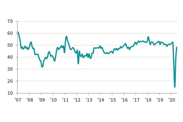 Индекс общей активности IHS Markit Eurozone Construction резко вырос с 39,5 в мае до 48,3 в июне. Эта цифра, которая лишь немного ниже значения 50,0 «без изменений», указывает на наименьшее снижение строительной активности в еврозоне с февраля. Данные опроса показали, что Франция и Италия зафиксировали рост объемов строительства, в то время как в Германии произошло дальнейшее заметное снижение.