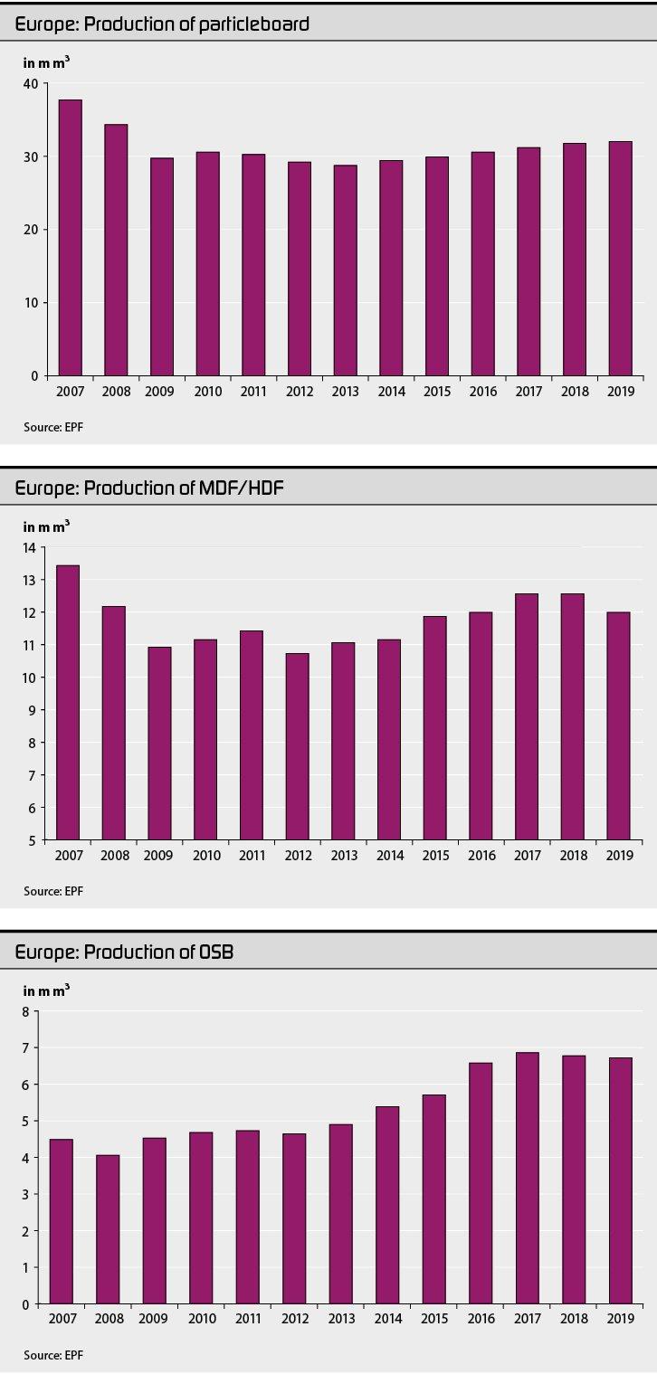 После снижения, отмеченного в 2008 и 2009 годах, производство МДФ / ХДФ, которое в 2007 году возросло до более чем 13 млн. м³, также снова увеличилось в 2010 и 2011 годах. После очередного снижения в 2012 году в 2013 году вновь началась тенденция к росту в последующие годы, в 2018 году небольшое увеличение на 0,3% до 12,6 млн. м³ все еще было зафиксировано. За 2019 год в годовом отчете EPF указывается только отдельный объем производства в случае Германии; таким образом, объем производства в этой стране снизился с 3,7% до 3,5 млн. м³, что в целом сократилось по сравнению с Европой. Поэтому доля Германии по отношению к европейскому производству в целом осталась неизменной на уровне 26%. Доля, внесенная Польшей, составила 20%; Испания с 9% опередила Италию впервые. Великобритания заняла пятое место. Эти пять стран вместе покрыли 71% всех европейских MDF / HDF производства. Значительные сдвиги были зафиксированы в отношении различной толщины панелей. Доля тонкой плиты толщиной менее 5 мм уменьшилась до 11% (9%). Панели толщиной от 5 мм до 9 мм способствовали общему производству на 24% (18%). Толщина более 9 мм, напротив, внесли только 65% (73%). 69% произведенного МДФ / ХДФ было доставлено в виде необработанных плит, доля в 31% имела покрытую или лакированную поверхность.