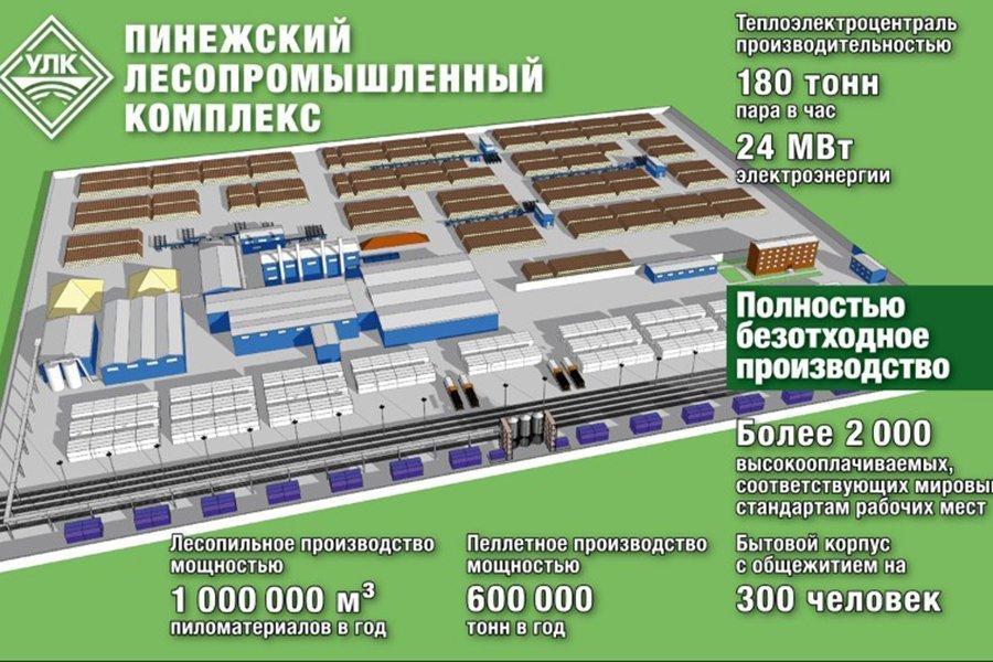 Отметим, что лесозаготовительное подразделение УЛК в Пинежском районе уже работает, а в 3 км от перспективного производства функционирует терминал отгрузки круглых лесоматериалов – на сегодня это крупнейшая площадка ГК «УЛК» с общей численностью сотрудников порядка 1 000 человек.