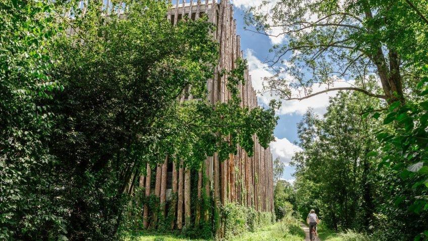 Упаковка парковки, то её фасад, состоит из 360 стволов сосен и лиственниц. Бревна высотой 15-17 м крепятся к постройке крепкими шурупами. Бревна были предоставлены WBV Pfaffenhofen. Внизу , у подножья поставленных вертикально бревен деревьев было высажено около 700 вьющихся растений (например, глицинии, плюща, хмеля, диких виноградных лоз и т. п.), которые должны постепенно озеленять естественный внешний фасад парковки, одновременно обеспечивая места для гнездования птиц и насекомых.