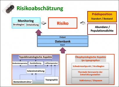 Мониторинг фенологии короеда типографа (время роения, начало заражения, развитие потомства, потенциальное количество поколений) является важной частью оценки риска заражения еловых насаждений .