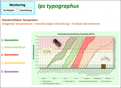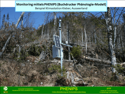 Развитие короеда типографа сильно зависит от температуры. Жуки начинают роиться только весной при превышении определенного температурного порога. Для развития насекомого от стадии яйца до летающего жука требуется определенное количество тепла. Это означает, что, в зависимости от сезонной погоды и местоположения, в более прохладных местах может не быть вылет только одного поколения, тогда как в более теплых регионах может сформироваться несколько генераций. Основываясь на параметрах развития и используя ежедневные данные о погоде в различных точках страны из Центрального института метеорологии и геодинамики (растровые данные INCA), можно рассчитать пространственный и временной ход развития короеда. Эту задачу решает цифровой инструмент PHENIPS plus, ориентированный на лесовладельцев и лесных менеджеров.