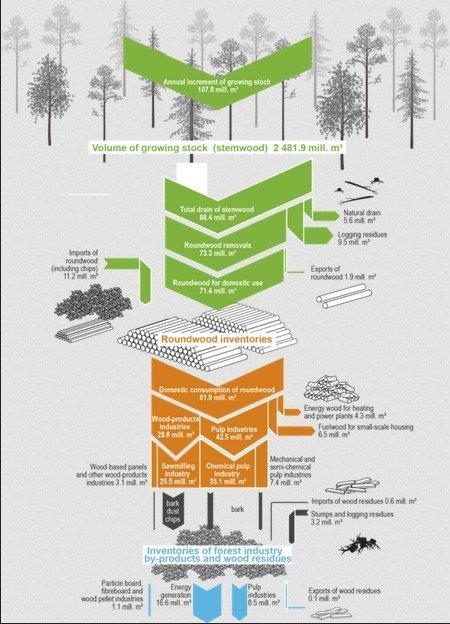 За последние десять лет доля сухого вещества древесины, потребляемого в качестве энергии, несколько увеличилась, и, соответственно, доля сухого вещества древесины, используемого в продукции лесной промышленности, снизилась. Пропорции меняются медленно.