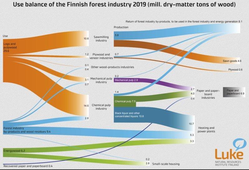 «Данные основаны на данных лесных счетов Института природных ресурсов Финляндии (Люк). Балансы использования и массы представляют собой поставки продукции лесной и лесной промышленности из различных источников и поток древесного материала от сырья к продукции и выработке энергии. В балансах использования использование и поставка древесины измеряются в твердых кубических метрах и тоннах, тогда как в балансах массы они преобразуются в единую единицу измерения: тонны древесины в сухом веществе. Это позволяет представлять результаты, охватывающие весь сектор, с использованием единой единицы измерения. Баланс массы позволяет отслеживать, как сухое вещество древесины связано с различными продуктами лесной промышленности, древесным топливом и отходами », – говорит Аарре Пелтола, старший статистик Luke.