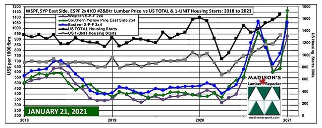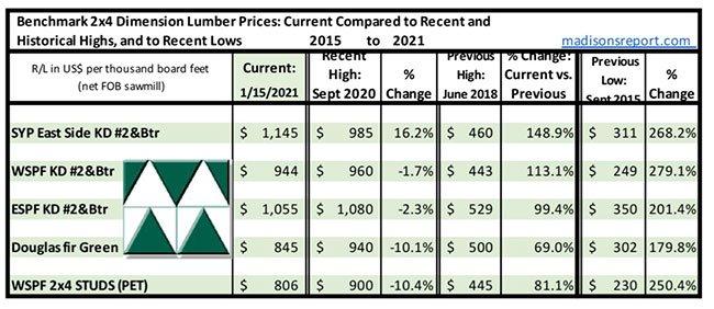 В целом, в 2021 году главный экономист Национальной ассоциации риэлторов США Лоуренс Юн прогнозирует, что продажи новых домов вырастут на 21%, а продажи старых домов вырастут на 9%. Он прогнозирует, что в этом году цены на жилье вырастут на три процента. См. Рисунок 5, где сравниваются текущие цены на эталонные пиломатериалы хвойных пород с недавними и историческими максимумами, а также с недавними минимумами.
