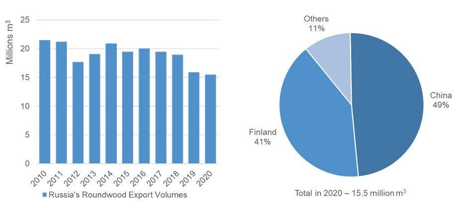 Россия на протяжении многих лет является одним из крупнейших мировых торговцев круглым лесом, экспортируя примерно 15-20 миллионов м3 в год в период с 2010 по 2020 год. Основными импортерами российского круглого леса традиционно являются Китай и Финляндия, на которые приходится около 90% от общего объема российского экспорта. На основании заявления президента Владимира Путина в прошлом году, поручившего правительству страны запретить экспорт необработанной или грубо обработанной древесины, экспорт круглого леса может быть серьезно ограничен со следующего года, если закон вступит в силу в соответствии с предложением. Планируется, что запрет коснется бревен хвойных пород и балансовой древесины, а также, возможно, березового фанерного кряжа. Окончательное решение по ассортименту и породам будет принято позже. Сырые пиломатериалы также могут быть частью запрета. Кроме того, Правительство рассматривает возможность введения ограничений на экспорт древесной щепы и некоторых древесных плит, таких как OSB и ДСП.