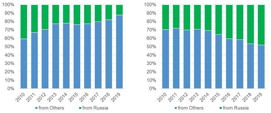 Рисунок 2. Доля России в китайском импорте круглого леса (слева) и пиломатериалов (справа)