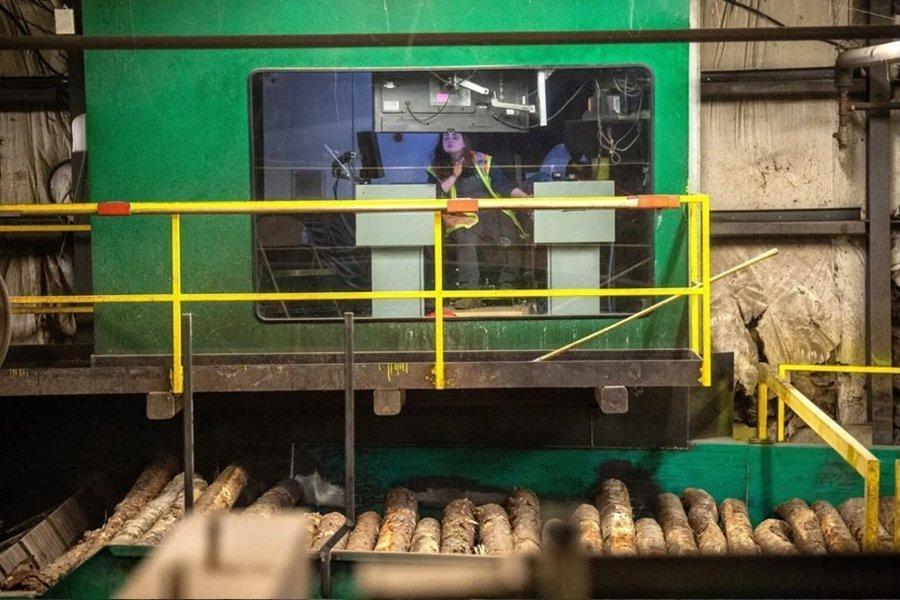 Кери Либби сидит в кабине оператора окорочной машины на Moose River Lumber в Джекмане 10 мая. Майкл Г. Симанс / Morning Sentinel