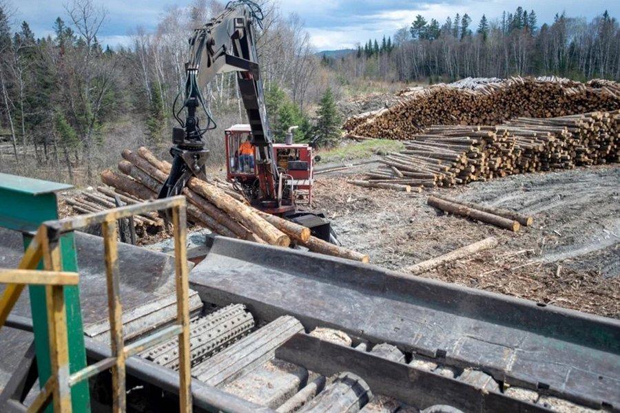 Бревна загружаются на сортировочную линию, чтобы начать процесс преобразования в различные пиломатериалы на заводе Moose River Lumber в Джекмане 10 мая. Майкл Г. Симанс / Morning Sentinel