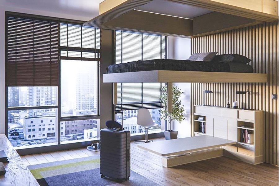 В одной форме Cloud Bed (Кровать в облаке) от Ori – это рабочий стол под кроватью-чердаком. Но при нажатии кнопки кровать опускается, а стол складывается в пол и скрывается из виду.
