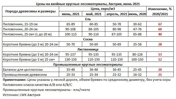 В Австрии высокий спрос, а также дальнейшее повышение цен на пиломатериалы хвойных пород в настоящее время в значительной степени способствуют заметному росту цен на пиловочник хвойных пород. Согласно текущему отчету о древесине, опубликованному Президентской конференцией сельскохозяйственных палат Австрии (LWK) в Вене, в новых контрактах цена B/C на свежие еловые бревна тем временем превысила отметку 100 евро/м³ у лесной дороги во всех частях Австрии. Отдельные переработчики, испытывающие нехватку поставок, недавно предложили лесовладельцам цены до 170 евро/м³.