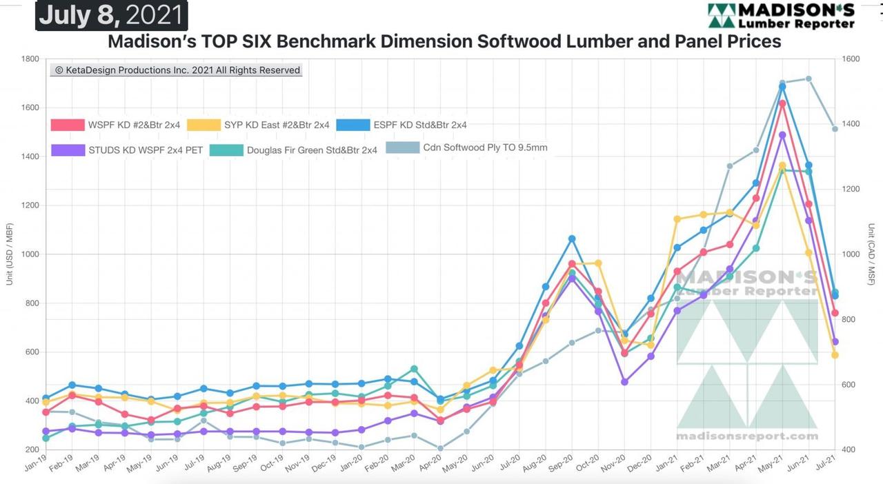 Сильное падение цен на пиломатериалы, начавшееся во время двойных праздников – Дня Виктории в Канаде и Дня памяти в США, продолжалось в течение пяти недель до двойных национальных праздников в начале июля. На следующей неделе цены на большинство пиломатериалов практически не изменились, что указывает на возможную стабилизацию баланса спроса и предложения. Удержатся ли эти текущие уровни цен, никто не знает. Могут ли цены снова вырасти? Или больше падать? Только ближайшие пару недель покажут. Одно можно сказать наверняка: цены на пиломатериалы не вернутся к «нормальному» уровню около 300 долларов, наблюдавшемуся за предыдущие 10 лет.