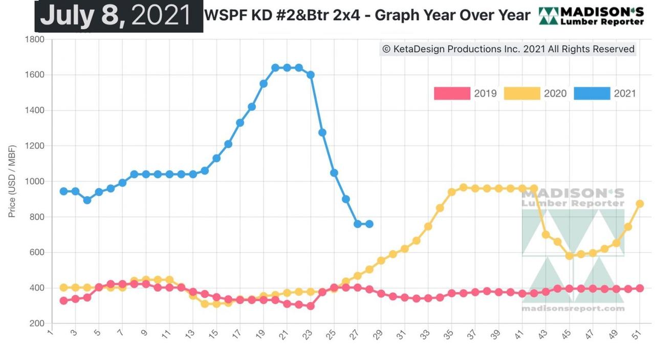 По сравнению с ценой год назад, когда она составляла 504 доллара США за 1000 доско-футов, за неделю, закончившуюся 8 июля 2021 года, цена Western S-P-F KD 2 × 4 выросла на + 256 долларов, или + 51%.